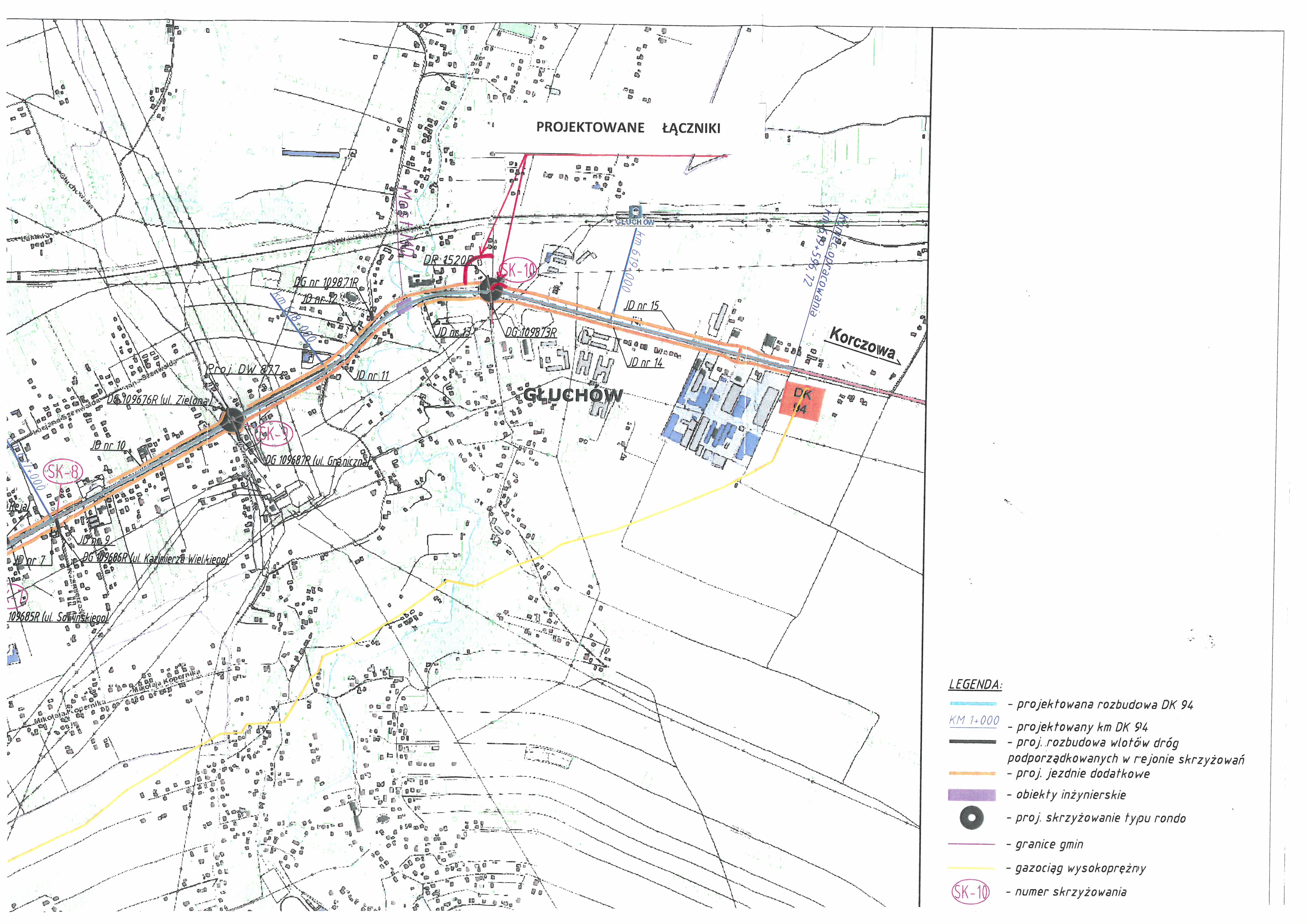 Zadaniem firmy jest zaprojektowanie nowego rozwiązania komunikacyjnego łączącego Ośrodek Kultury w Głuchowie z budowanym rondem oraz drogi publicznej łączącej drogę powiatową (w kierunku Dębiny) z drogą serwisową prowadzącą do Zespołu Szkół oraz kościoła. Po zakończeniu prac projektowych niezwłocznie rozpoczniemy realizację zadania. Wybudowane drogi stworzą komunikacyjną całość z przebudowaną DK 94.
